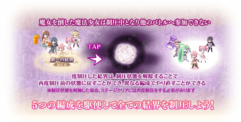 ステージ内で魔女を倒した編成の魔法少女は、その魔女結界を制圧中の状態となりステージ内の他の魔女結界へのバトルに編成できなくなります。