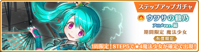 ※『有償限定 ステップアップガチャ ウワサの鶴乃 アニメver.編』の★4魔法少女確定までのカウントは『期間限定 ウワサの鶴乃 アニメver. ピックアップガチャ』とは異なります。