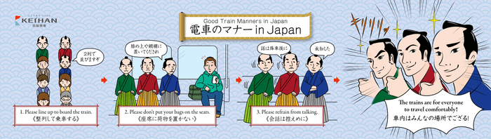 京阪電気鉄道株式会社(本社:大阪市中央区、社長:中野道夫)では、電車内でのマナー向上を呼びかけるマナーポスター「電車のマナー in Japan」シリーズを4月から展開しており、12月1日(火)から第3弾を掲出します。