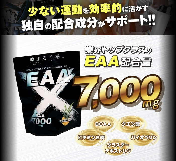 EAAXは必須アミノ酸であるEAAの配合量が1杯で7,000mgと海外並みの配合量。さらに理想的なボディを実現するためにビタミンB群、バイオぺリン、クラスターデキストリン、クエン酸など4つの成分までも配合しています。