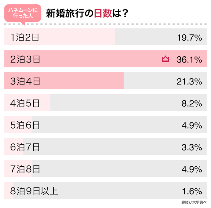 上のグラフは、新婚旅行の日数について聞いたものです。もっとも多かったのは「2泊3日」で36.1%でした。次に多いのは「3泊4日(21.3%)」「1泊2日(19.7%)」の順で、3泊以内だった人が77.1%にも及びました。多くの人が短期滞在を選んだことが分かります。