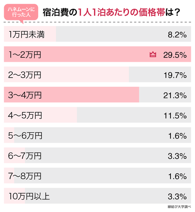 新婚旅行で宿泊した旅館やホテル等の価格帯についても聞いてみました。もっとも多かったのは、1泊当たり1人「1~2万円」で29.5%でした。次に多かったのは、「3~4万円」で21.3%です。1泊1人当たりの金額では、「1~4万円」が合計70.5ポイントでボリュームゾーンであることが分かりました。