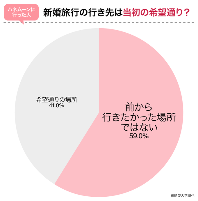 その結果、「前から行きたかった所ではない」が59%と過半数を占めました。新婚旅行に行った人の約6割が、当初行きたいと思っていた場所を変更せざるを得なかったことが分かりました。
