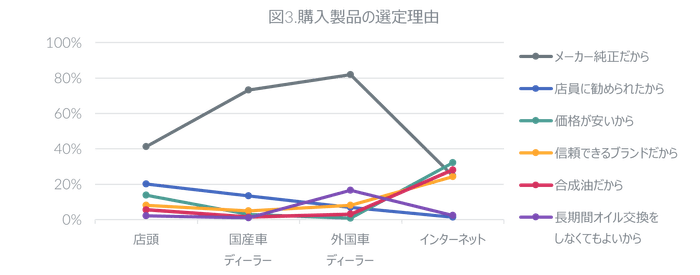 インターネットでの購入者は「価格が安いから」が最も多く32%、「合成油だから」が28%であった。この結果より、インターネットで高性能な製品を安く買いたいという意向が窺えた。