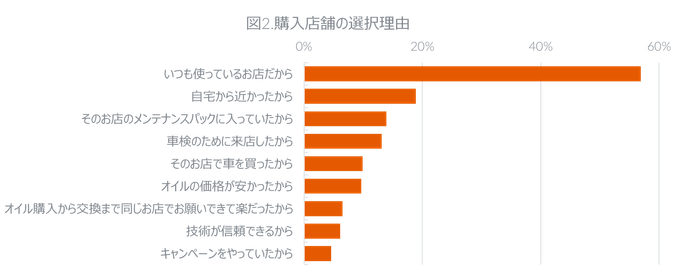 直近1年間でエンジンオイル交換をしたドライバーのうち、95%がカーディーラーやカー用品店、ガソリンスタンドなどの店頭で購入をしていた。店頭購入者にその店舗を選んだ理由について尋ねたところ、「いつも使っているお店だから」が57%、「自宅から近かったから」が19%であった(図2)。続いて「そのお店のメンテナンスパックに入っていたから」が14%であったが、国産車ディーラーでの購入者では26%に達した。