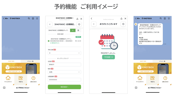 「KNOTBOX」の予約機能は、イベントやポップアップストアなどの開催日が限定された単発予約、また、店舗の来店予約などの期間を限定しない継続予約のどちらにも対応しております。LINE公式アカウント上に予約機能を設けることで、ユーザーはWEB登録やアプリのダウンロードを行うことなく、LINE上のみで簡単にイベントや店舗来店の予約が可能です。