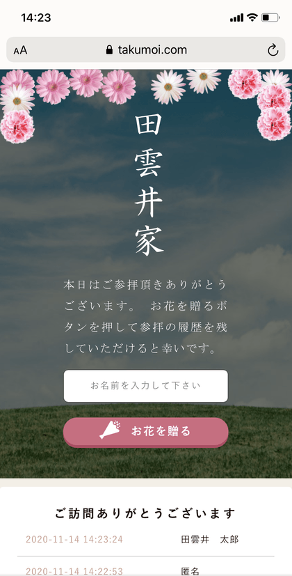 ご家族のページのお花を贈るボタンを押すとページ上にお花が咲きます。