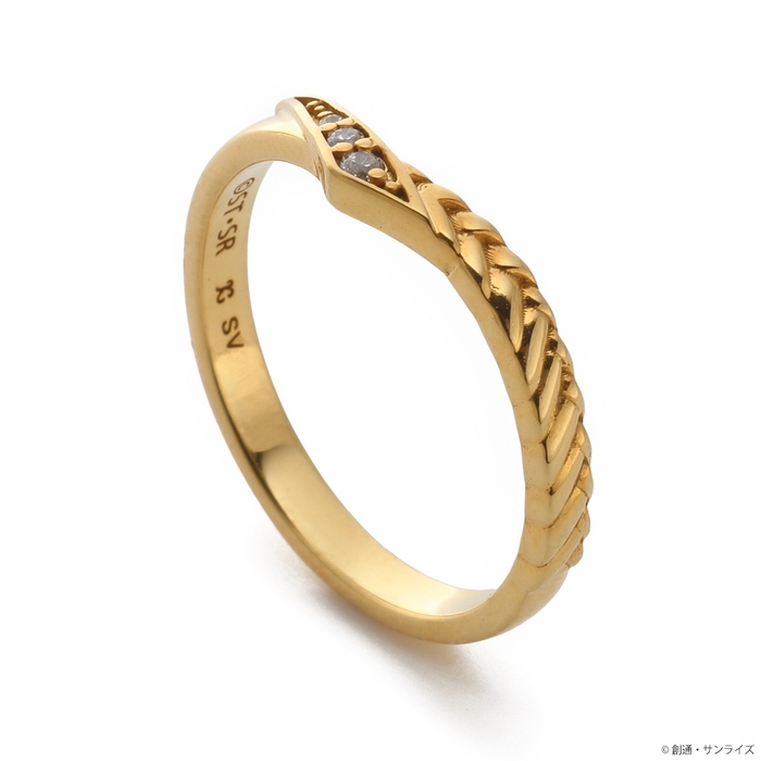 『新機動戦記ガンダムW』30周年をお祝いしたシルバーリングです。リリーナ・ドーリアンモデルは、V字タイプの片側に、編み込んだ髪をモチーフとして取り込んだデザイン。中央には3石のストーンがきらめきます。リリーナのブロンズの髪をイメージしたイエローゴールドコーティングで仕上げ、内側には名前の刻印を施しました。