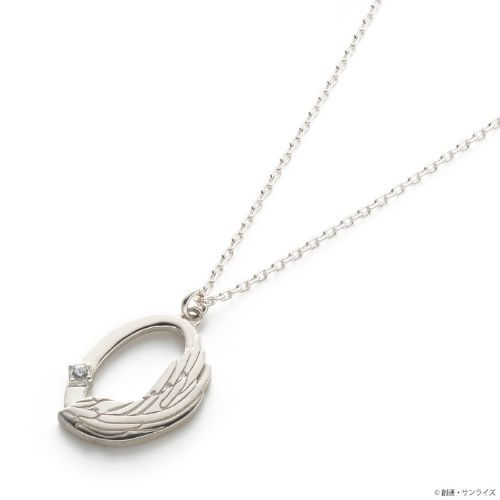 ワンポイントの石がきらめく、ウィングガンダム0の羽をモチーフにしたデザイン。スライドチェーンを使用しているため、お好みの長さに調節して着用できます。