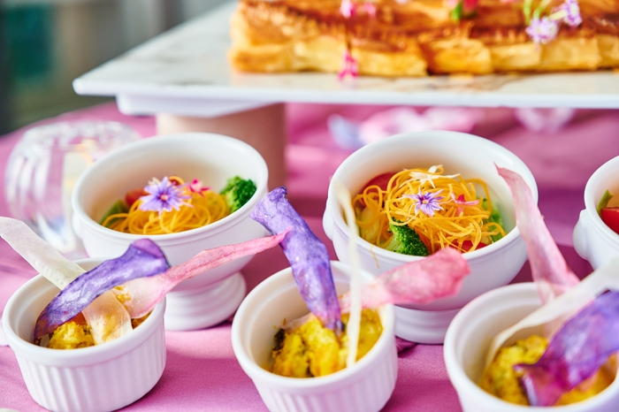 ラプンツェルの姿が描かれたフラワープリンセスムース、王子様との甘酸っぱい恋の味をイメージしたブルーベリーとレモンのタルト、たくさんの花々に彩られたカラフルフルーツロールケーキ、ラプンツェルの長い髪をイメージしたチュロスなどのスイーツに加え、地元・宮城県産の春野菜を使用した色鮮やかな料理など、お子様から大人まで楽しめる20種類以上のお料理&スイーツをお好きなだけご堪能いただけます。