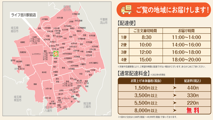 “おいしい” “ワクワク” “ハッピー” をお届けするライフコーポレーションは、7月3日(水)より吉川駅前店で「ライフネットスーパー」のサービスを開始しました。