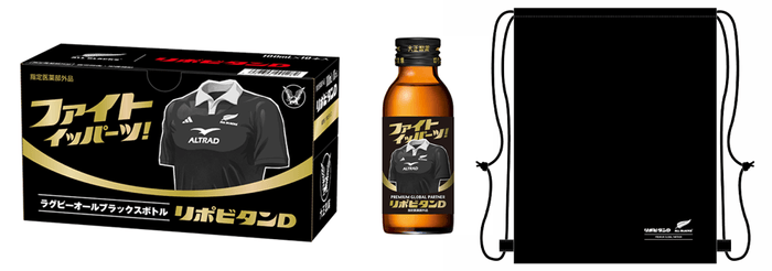 大正製薬ダイレクトと楽天市場での販売で、30本入りを限定販売します。また、ノベルティとして「リポビタンD ラグビー日本代表応援ボトル」には、桜のエンブレムとリポビタンDロゴ入りの白のオリジナルランドリーバック、「リポビタンD ラグビーオールブラックス応援ボトル」には、シルバー・ファーンのエンブレム入りの黒のランドリーバックが付いています。