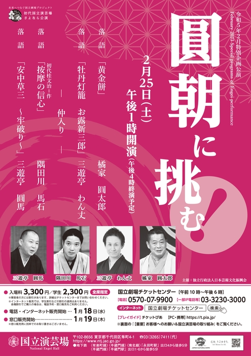 初代国立演芸場さよなら公演『2月特別企画公演 圓朝に挑む!』開催決定 カンフェティにてチケット発売