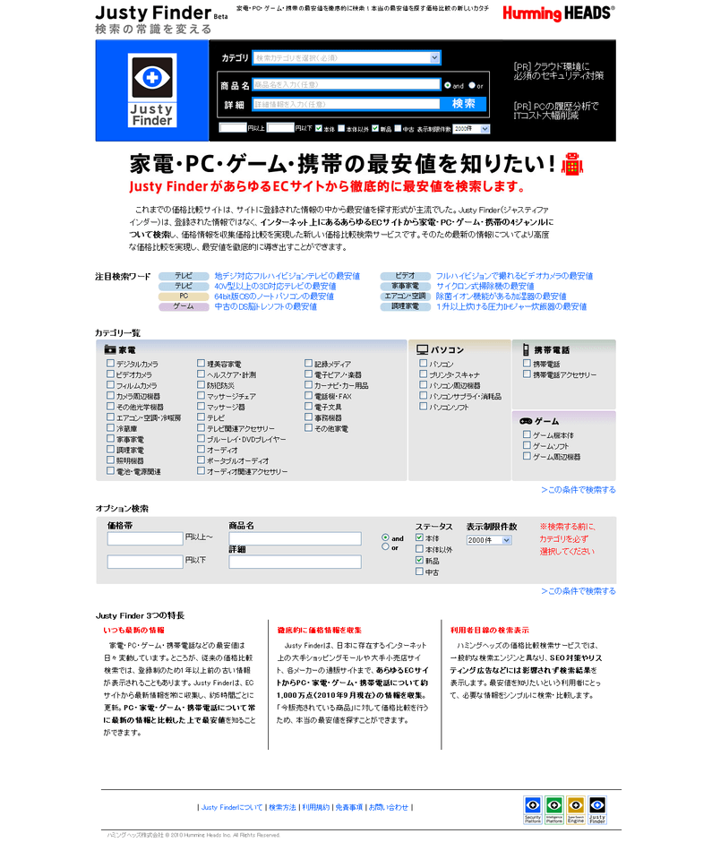 ハミングヘッズ、検索エンジン「Justy Finder」【家電・PC・ゲーム・携帯】買いたい商品の価格検索がよりスムーズに。最安値を徹底的に検索!
