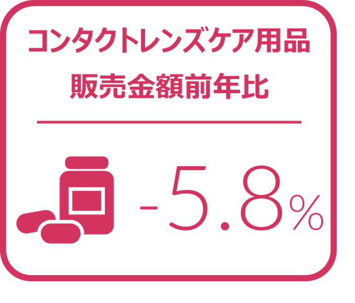 2024年第1四半期(1‐3月)のコンタクトレンズケア用品の販売は、金額前年比5.8%減とマイナスで推移した。店頭では11.6%減、インターネットは0.3%増となり、インターネットが減少からプラスに転じた。