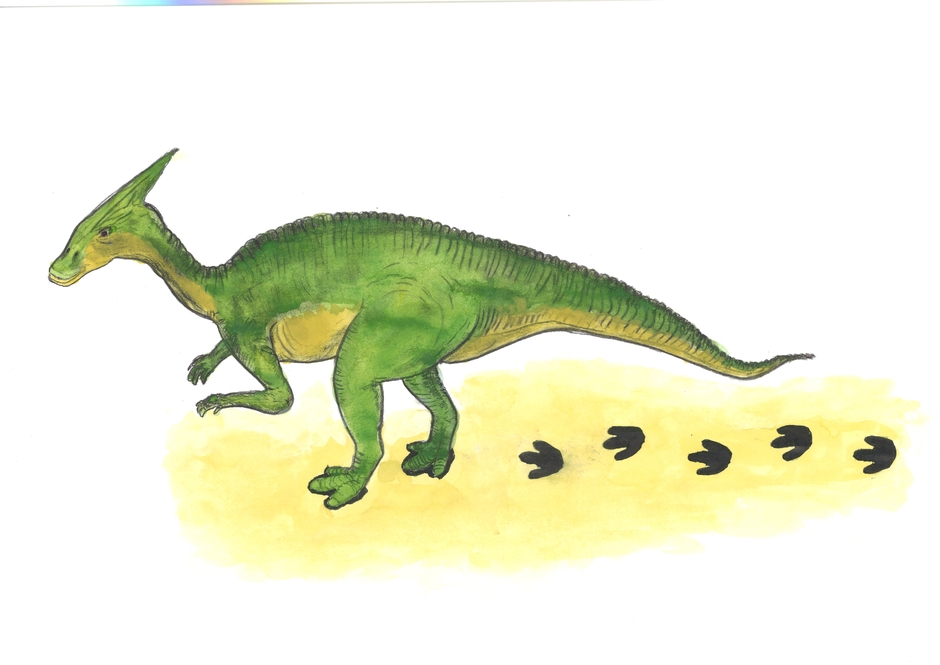 この大型鳥脚類は、付近の地層から産出する「サウロロフス」と推定され、全長は15~18m程度と推定されます。これはティラノサウルス(全長約12m)よりもはるかに大きく、そのような巨大な2足歩行恐竜が白亜紀最末期のモンゴルにいたことを証拠づけるものです。付近からはこのほかにも大小さまざまな恐竜足跡化石が多く発見されており、調査を進めることで、恐竜の生態がより詳しく明らかになってくるとみられます。