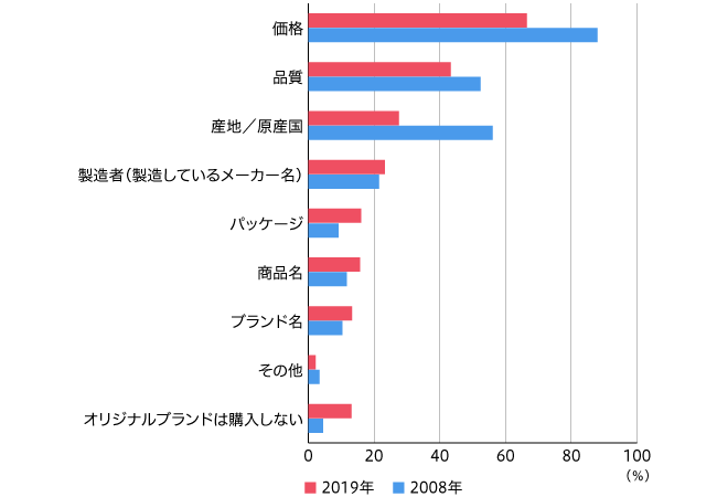 プライベートブランドを購入する時に重視することは「価格」が約7割。2008年と比較では「産地/原産国」を重視する割合が下がっている