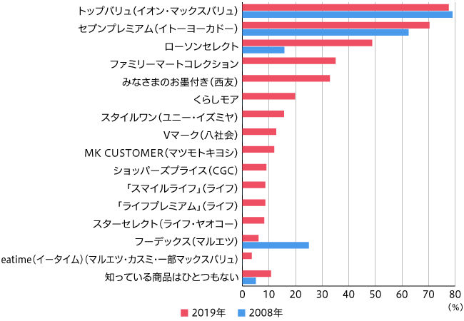 流通各社が展開するプライベートブランドの認知状況について聞いたところ、認知率はトップバリュがもっとも高く77.6%となり、セブンプレミアム(70.4%)、ローソンセレクト(48.8%)という順になりました(図1)。この結果を11年前の2008年と比較してみると、トップバリュは微減(1.4ポイント減)、セブンプレミアムが7.9ポイント上昇しています。