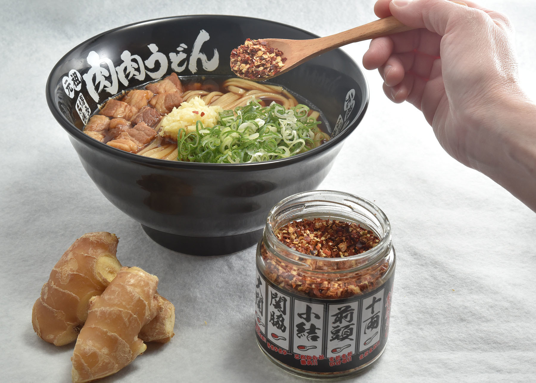 コクのあるスープとゴロゴロした存在感のある肉、強烈な生姜に負けないよう強いコシと食感にこだわり、試行錯誤を重ねて開発した太くコシのあるうどん麺は厳選した小麦・塩・水のみで作っています。