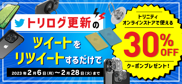 2023年2月28日(火)までの期間、当社の社員一同が更新するブログ【トリログ更新】のツイートをリツイートするだけで、トリニティオンラインストアで使える30%OFFクーポンをプレゼントいたします。