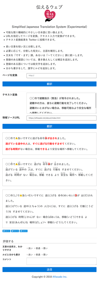 アルファサード株式会社(所在地:大阪府大阪市、代表取締役:野田 純生)は、災害情報や災害で避難中の人のうち、主に在留外国人や知的障害者への情報伝達に役立つとされる「やさしい日本語」での情報発信を支援するウェブサービスの提供を開始します( https://tsutaeru.cloud/ )。利用料金は無料。