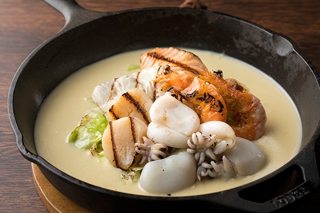 グリルした鱈、エビやホタテなどを、グリエール、エメンタール、チェダーチーズをブレンドしたフォンデュソースを絡めてお召し上がりいただくホットポット。旬のシーフードの旨味を存分にお楽しみいただけます。