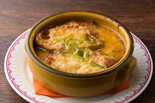 あめ色になるまでじっくりと炒めた玉ねぎと長葱を煮込み甘味とコクを閉じ込めた、寒い冬に食べたくなる温かなオニオングラタンスープです。春菊とシナモンを加え風味豊かに仕上げました。