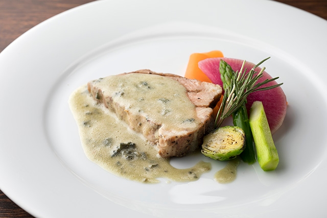 低温でゆっくり調理し、柔らかくなった豚ロースのブロックを、仕上げにグリルすることによって香ばしくジューシーな味わいに。ブルーチーズが香るガーリックソースと共にお召し上がりください。
