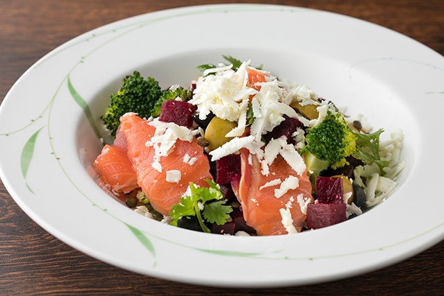 ギリシャの代表的なフェタチーズのサラダ。フェタのさっぱりとした酸味が、ビーツの甘みを引き立てます。オリーブ、レンズマメ、ブロッコリーの食感の楽しさと、スモークサーモンやコリアンダーなどの香りが食欲をそそります。