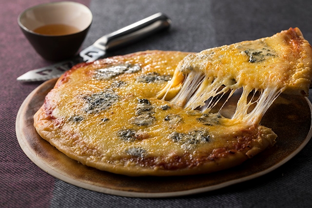 パルメザン・モッツァレラ・ブルー・レッドチェダの4種チーズを使用したピッツァ。とろけるチーズとグリル機で焼き上げたサックとした生地の相性の良さをお楽しみください。はちみつの甘さがチーズの味わいを引き立てます。