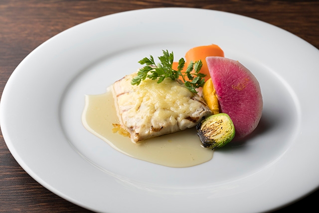 旬の魚をグリルし、その上に溶岩に見立てたエメンタールチーズをトッピングしました。チーズとアクセントのスイートチリソースが旬の魚の旨味をさらに引き立てます。