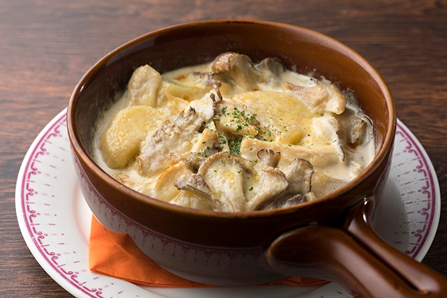 フランス・アルザス地方のマンテールの谷が名前の由来のマンステールチーズを、茸や甘みの強いキタアカリにのせ香ばしく焼き上げました。独特の風味が病み付きになるグラタンは、ぜひ一度お試しいただきたい一品です。