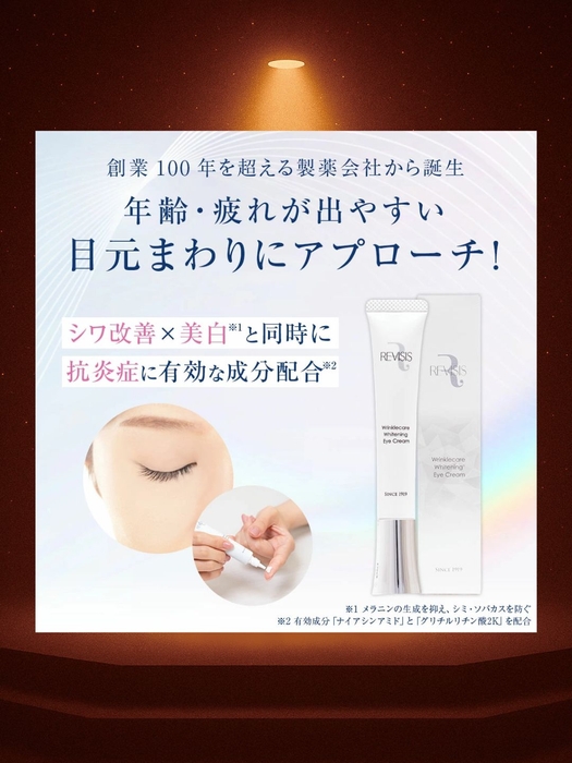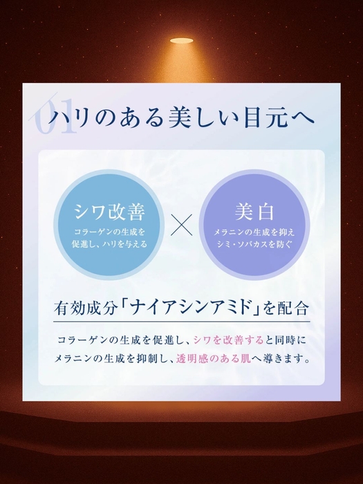 本製品は、有効成分「ナイアシンアミド」を配合し、シワの改善およびメラニンの生成を抑えてシミ・そばかすを防ぐ薬用アイクリームです。