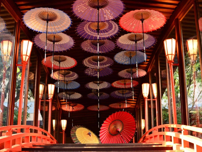 雨の日に欠かすことのできない和傘を、館内のさまざまな場所に彩り豊かに設えます。「和ンブレラスカイ」は、界 出雲のシンボルでもある太鼓橋の上に和傘を飾ることで、和紙の柄だけではなく、内部の骨組みの美しさを引き立たせます。雨の日に和傘をさしているような感覚を、館内に滞在しながら楽しむことができます。また、お食事処に隣接する竹庭と大浴場の露天風呂に設えた和傘は、日が暮れるとライトアップされ、お食事を楽しみながら、露天風呂に入りながら、色鮮やかな和傘が並ぶ幻想的な景色を堪能することができます。
