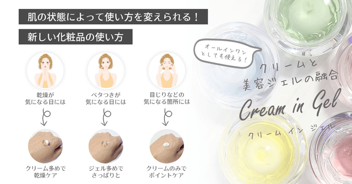 人の肌はその日によって状態が変わります。乾燥している際は濃い目のクリームを塗ったり、軽いスキンケアがしたい時はベタつかない商品を使ったりと使い分けることも多いかと思います。そこで登場したのが、自分の匙加減でクリーム感を変えられる製品「クリームinジェル」です。美容ジェルの中に濃い目のクリームが包餡充填してあり、肌の状態に合わせてジェルとクリームの量を調整して使用いただける新しいスキンケア商品です。軽めに塗った後でも気になる箇所にはクリームを重ね塗りすることができるので、目じりやほうれい線もしっかりカバー可能です。