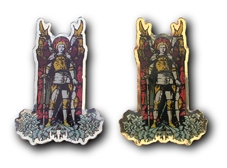 甲冑を着た大天使の複雑なデザインを、多彩な表現が可能なプリント工法により細部まで忠実に再現して完成した作品は、金とニッケルのメッキが異なる2種類のオリジナルピンバッチ。記念品として配布された社員の皆さんはもちろん、同社の美術館で購入されたお客様にも好評とのこと。ご担当者様からは「色々とご迷惑をお掛けしましたが、お陰様で無事に納品、配布することができました。ありがとうございました」と、感謝のメッセージを頂戴することが出来ました。