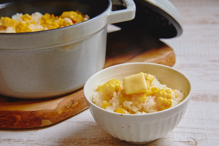 トウモロコシ生産者の「ハマラノーエン」おすすめの「生トウモロコシごはん」を、八ヶ岳の魅力を発信するセレクトショップ「八 」で提供します。トウモロコシの食感を楽しむために、半分はごはんと一緒に炊き、残りは生のまま混ぜるのがポイントです。