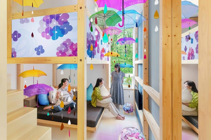 星野エリアにある「星野リゾート BEB5軽井沢」では、「軽井沢アンブレラスカイ」をモチーフとした新客室「アンBEB(ベブ)ラルーム」が登場します。お部屋が傘で装飾されるほか、ルームキーやルームウェアも傘仕様に!アンブレラスカイをさらに楽しみたい方におすすめの客室です。