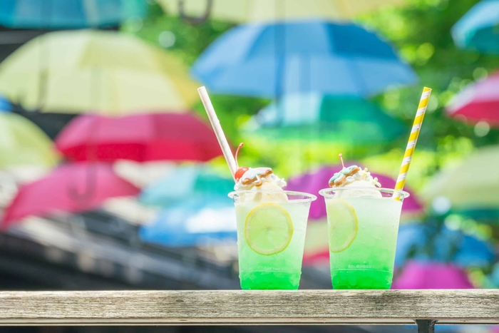 軽井沢アンブレラスカイをイメージした、テイクアウトドリンクを星野エリア内にある複数店舗で販売します。食のセレクトショップ「ココペリ」では、傘やアジサイの花をかたどったクッキーとメレンゲをトッピングしたクリームソーダを販売します。また、ハルニレテラスから徒歩5分の「カフェ ハングリースポット」では、数量限定で「虹色レモネード」を販売。カラフルなゼリーが入ったレモネードの上に、雲をイメージしたソフトクリームを添えた見た目も爽やかなドリンクです。
