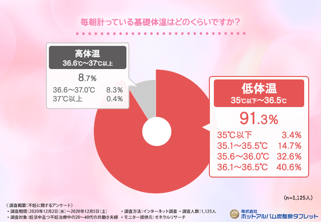 「毎朝計っている基礎体温はどのくらいですか?」と質問したところ、グラフからもわかるように健康的な人の平熱と言われる36.5℃以上の方はわずか8.7%で、低体温の方がなんと91.3%という結果となりました。