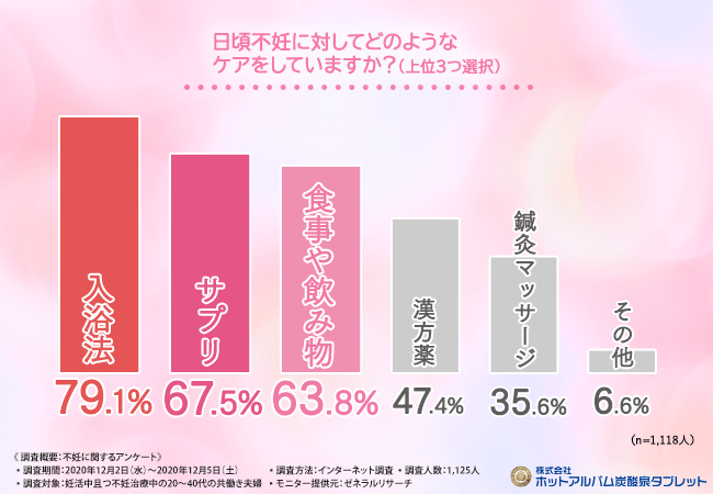 そこで、「日頃不妊に対してどのようなケアをしていますか?(上位3つ)」と質問したところ、『入浴法(79.1%)』と回答した方が最も多く、次いで『サプリ(67.5%)』『食事や飲み物(63.8%)』『漢方薬(47.4%)』『鍼灸マッサージ(35.6%)』と続きました。