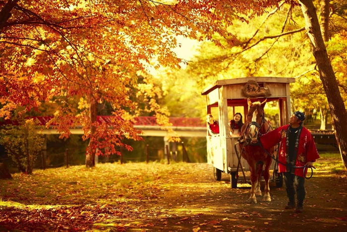 青森屋の敷地内には公園があり、秋になるとカエデやコナラ、ブナなどの木々が赤や黄、オレンジに色づき、紅葉狩りを楽しむことができます。馬車に乗って公園を巡ることで、ゆっくりと馬車の中でりんごを味わいながら紅葉を堪能できます。