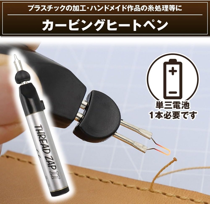 縫い終わりをライターで炙っている方も多いはず…。確かに糸の先端は丸くなりますが、ヘリを焦がしてしまったりライター自体扱うのが怖いといった意見もあります。カービングヒートペンはボタン1つで、糸を綺麗にカット&ほつれ防止の処理もできる画期的なアイテムです。直火を使わないため怪我のリスクも少ないです。