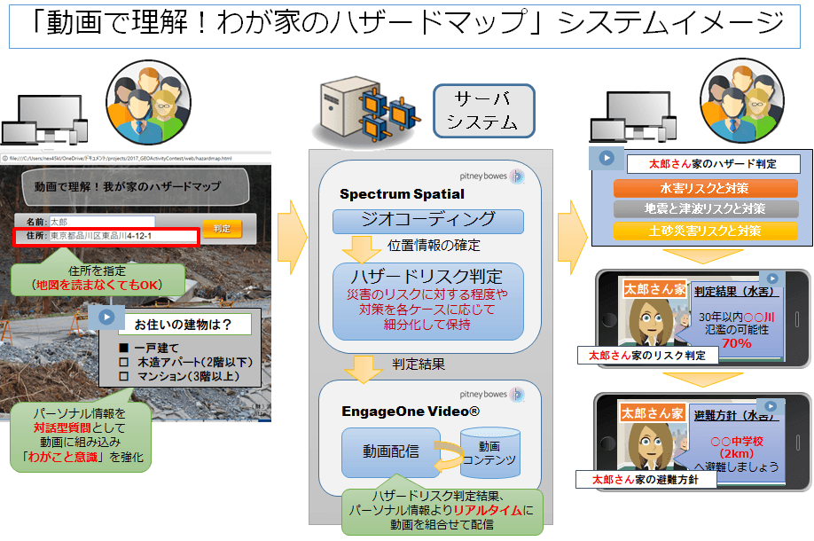 「動画で理解!わが家のハザードマップ」は、立地によって異なる避難情報を各戸専用の動画で読み聞かせる地理情報システムです。ハザードマップと呼ばれる防災用の地図を十分に読み解くことが難しい方や無関心な層でも、パーソナライズされた動画を通じて災害リスクを理解し、正しい災害への対応を促すことを目的とするものです。