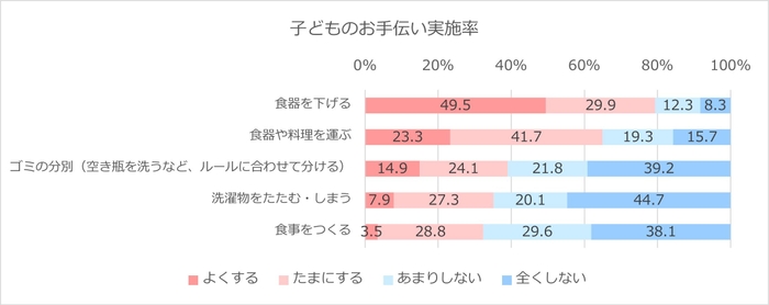 一方、家族みんなのためのお手伝いの実施率はどうでしょうか。「洗濯物をたたむ・しまう」「食事をつくる」も3割以上の子どもがお手伝いしていますが、「よくする」と回答した人は1割にも満たない結果となりました。さらに、リビングやお風呂の掃除、洗濯機を回したり洗濯物を干したりなど、その他の様々なお手伝いについて「よくする」「たまにする」子どもは、3割を下回りました。子どもが参加している家事は非常に限られていることがわかります。