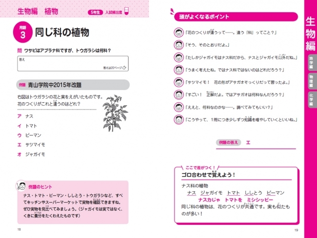 そして次のページには、入試問題の解答と共に、先生と生徒の会話形式で、例題を解くためのポイントを解説。「ここで差がつく!」のコラムでは、覚えるためのゴロ合わせなど、知っておくとためになる日常学習のコツも紹介しています。