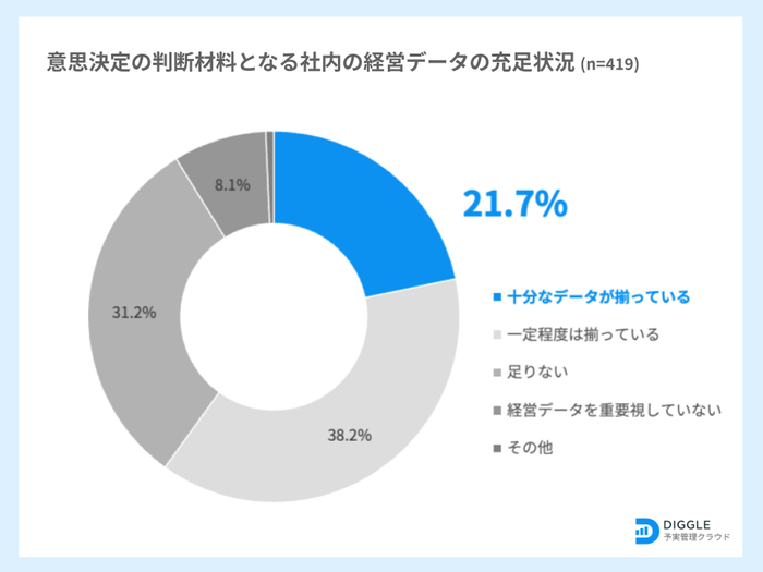 Q. あなたが事業評価や投資などの経営の意思決定を行うにあたって、判断材料となる社内の経営データ(経営指標や事業・各部のKPI指標の進捗状況やその背景など定量・定性情報を含む)は十分に揃っている状態ですか。あなたが意思決定を行う際に感じることとして、もっともあてはまるものをお選びください。(n=419)