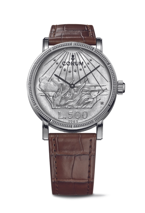 イタリア・500リラ銀貨を薄くスライスし、自動巻き2針ムーブメント(Cal. CO 082)を挟み込むようにケーシング。銀貨のデザインを損なわないよう、秒針やインデックスのないミニマルなダイアル表示を採用しています。