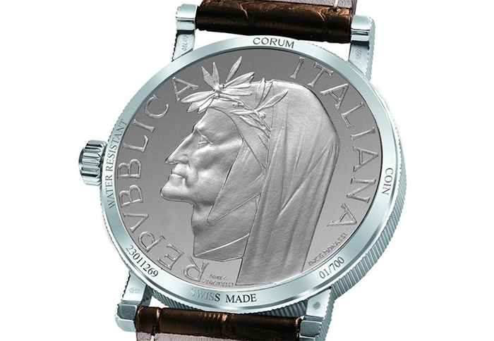 銀貨の表面(ケースバック側)にデザインされた、栄光を象徴する月桂樹の冠を戴いたダンテの肖像画は、ヴァチカン宮殿「ラファエロの間」に描かれたフレスコ画『パルナッソス山』に登場するダンテがモチーフ。下部に、コインをデザインした2人の著名な彫刻家ヴェルジネッリとモナッシの名が刻まれています。