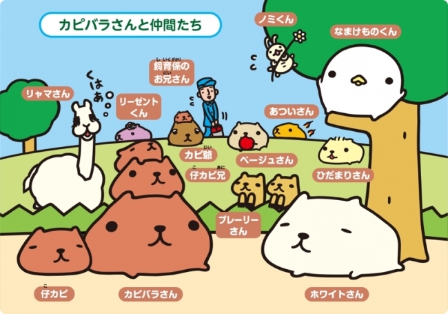 その愛らしい姿と「カピバラさん」をとりまく様々なキャラクター(ホワイトさん、仔カピ、カピ爺、リャマさん、なまけものくん、ノミくん、リーゼントくん、飼育係のお兄さん)たちが生み出す独特の世界観が話題となり、20~30代OLを中心に幅広い年齢層から支持されています。書籍はシリーズで30万部を超える人気となり、その他携帯コンテンツ、日常雑貨、ぬいぐるみなど様々な分野で展開し、着実にその認知を拡大しています。